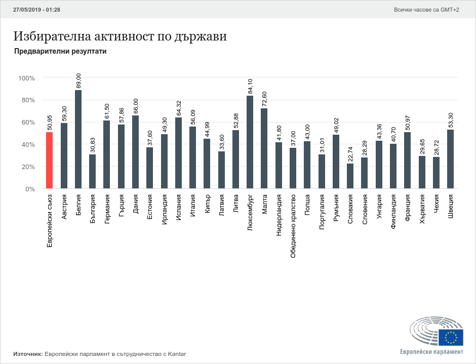 Активността на вчерашните избори в ЕС е била 50,8 на сто, като най-висока е отчетена в Белгия - 88,47 на сто, а на следващите места застават Люксембург (84,1 на сто), Малта (72,7), Дания (66), Испания (64), Германия (61,41). Най-ниска е било участието на избирателите в Словакия (22,74), Словения (28,29), Чехия (28,72), Хърватия (29,65), България (30,83), Португалия (31,01). На вчерашните избори в ЕС за първи път от 1979 г. се отчита ръст в участието на гласоподавателите за последните две десетилетия.