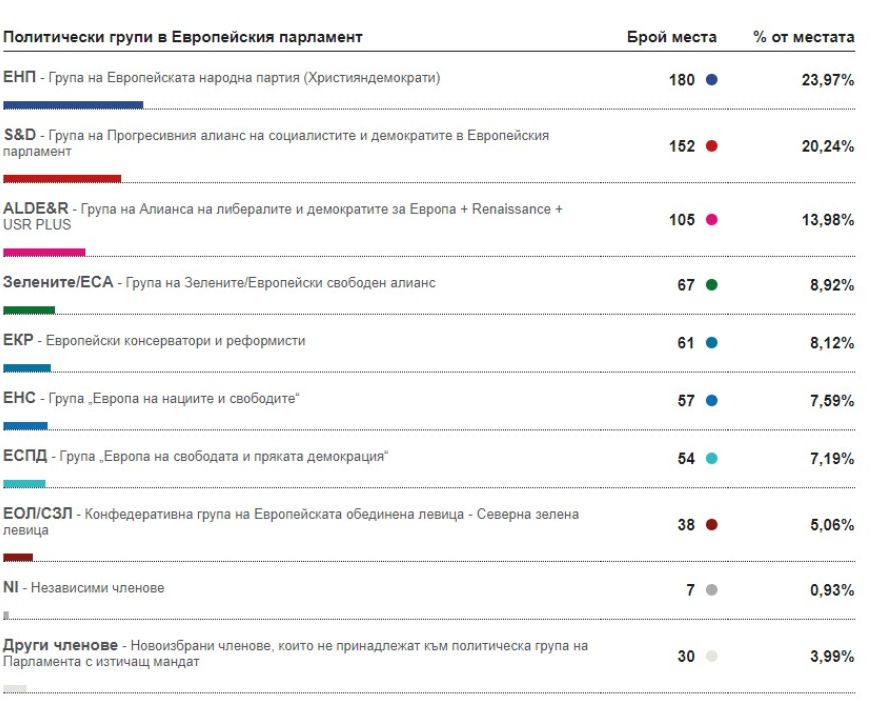 Данните предвиждат ЕНП да остане първа сила със 182 места (217 досега), социалистите да бъдат втори със 147 (186 досега), трети се очертават АЛДЕ със 109 (68 досега, но към тях вече се приспадат гласовете за партията на френския президент Еманюел Макрон). Зелените получават 69 места (52 досега), Европейските консерватори и реформатори - 59 (76 досега), Европейската обединена левица - 38 (52 досега).