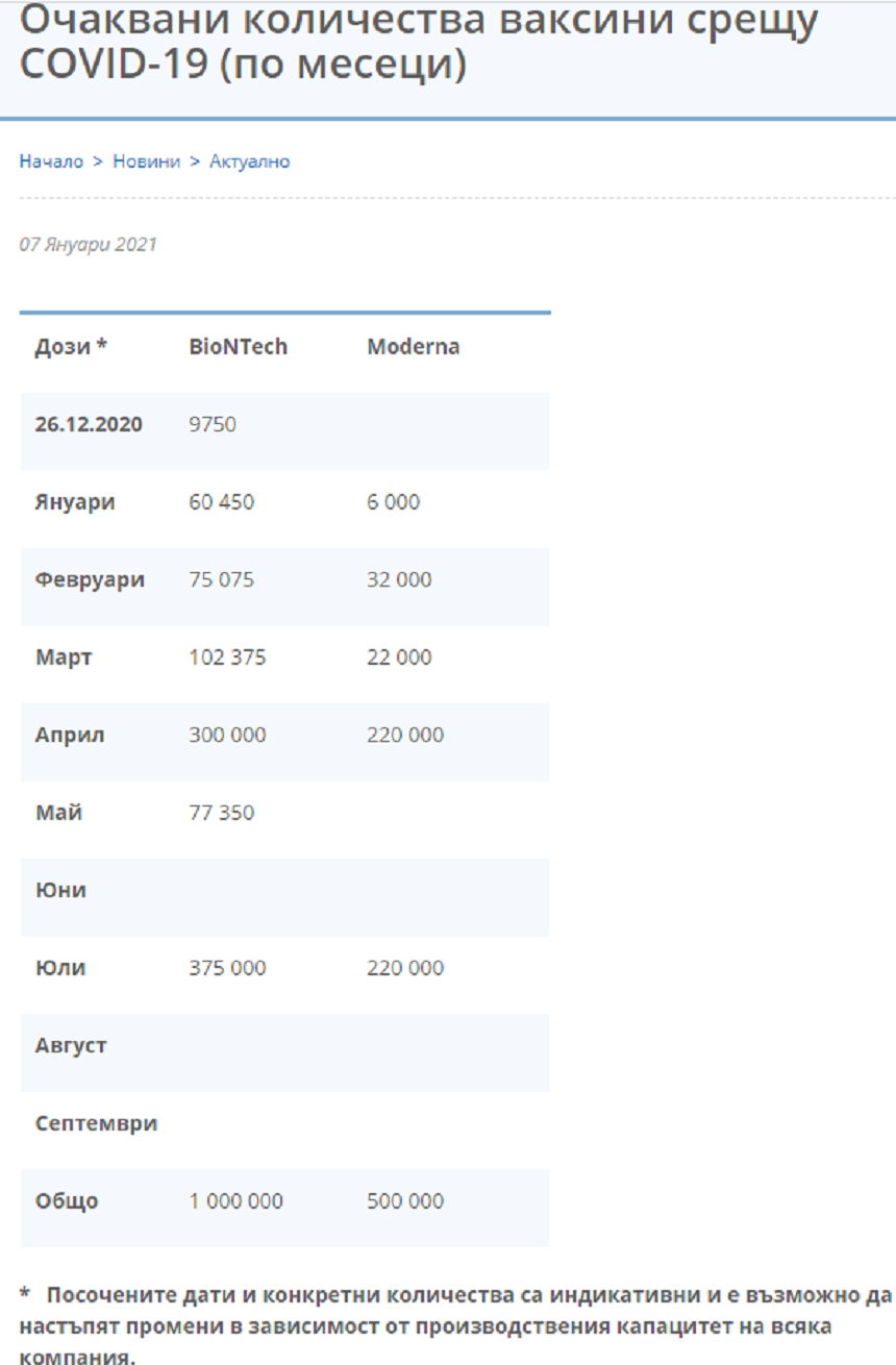 „Посочените дати и конкретни количества са индикативни и е възможно да настъпят промени в зависимост от производствения капацитет на всяка компания“, е посочено в съобщението на здравното министерство.