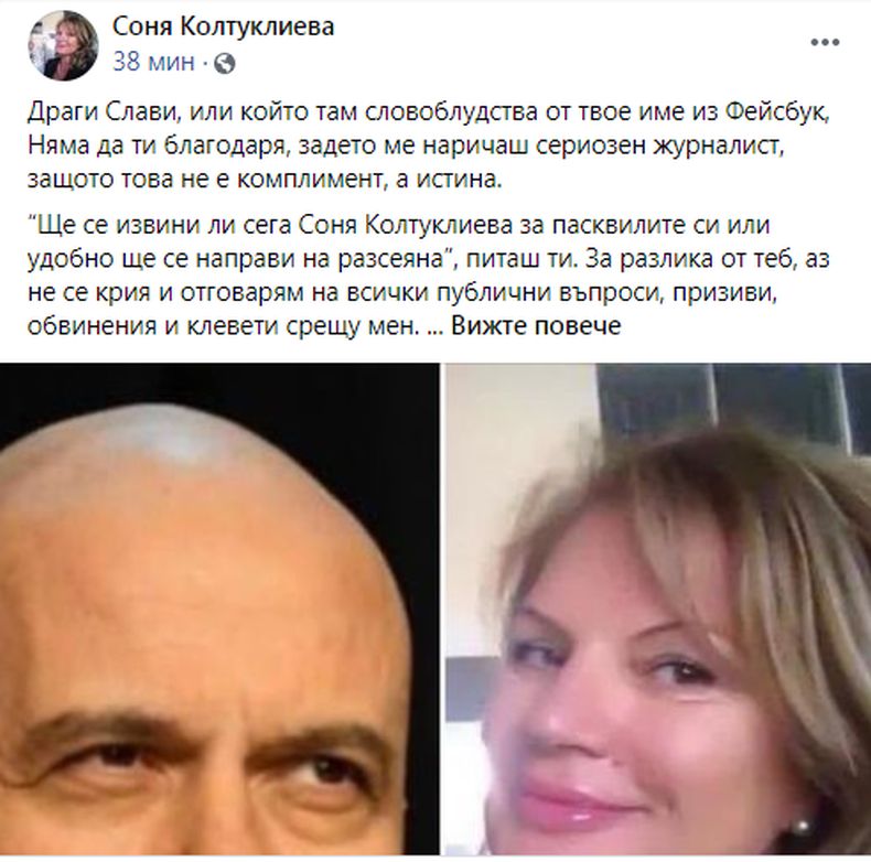 Журналистката Соня Колтуклиева: Слави, за разлика от теб, аз не се крия и отговарям на всички публични въпроси, призиви, обвинения и клевети срещу мен