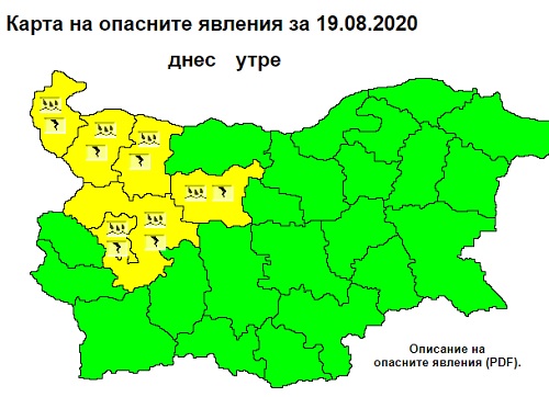 Жълт код за обилни валежи и гръмотевици е в сила за 6 области на страната за 19 август. Това сочи справка на сайта на Националния институт по метеорология и хидрология (НИМХ).