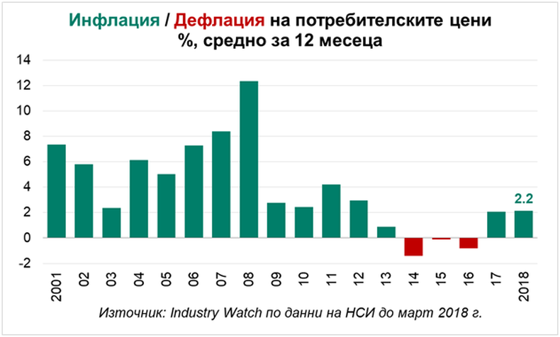 Потребителската инфлация достига 2,2% средно за последните 12 месеца до март 2018 г. Внесената отвън инфлация се ускорява, макар че еврото поскъпна с двуцифрени темпове спрямо щатския долар през 2017 г. Измерена през дефлатора на вноса, тя е положителна за първи път от 2012 г. насам. Засилването на единната европейска валута донякъде смекчи ефекта на поскъпването на суровините върху общата ценова картина в България. Тенденцията на покачване на цените на суровините обаче продължава и през 2018 г. През март суровият петрол и природният газ са около 30% по-скъпи спрямо година по-рано, докато цената на медта и алуминия се е вдигнала съответно с 16,7% и 8,8% за 12 месеца. Определени хранителни суровини също поскъпват. Цената на захарта в ЕС се е повишила с 14,3% спрямо март 2017 г.