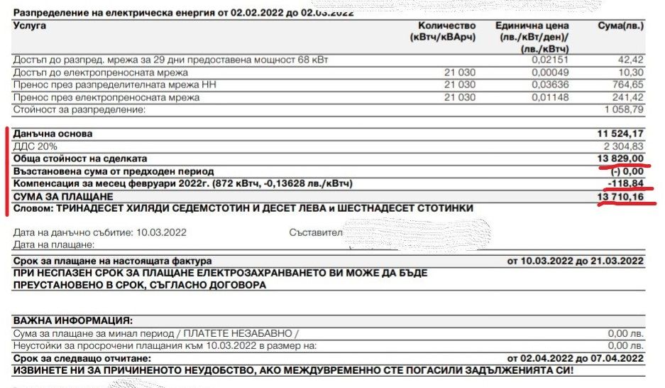 Ставаме свидетели на пореден абсурд при започналите да валят фактури за ток за месец февруари 2022 г. Собственик на заведение получи сметка за ток на стойност 13 829 лв., в която отразените във фактурата компенсации, широко рекламирани от държавата, са в размер на 118.84 лв. И това при положение, че в сравнение на същия период на минали години същият обект е плащал 5 до 6000 лв. Това се казва в позиция на Българската асоциация на заведенията и Сдружението на заведенията в България, откъдето разпространиха факсимиле на въпросната сметка.