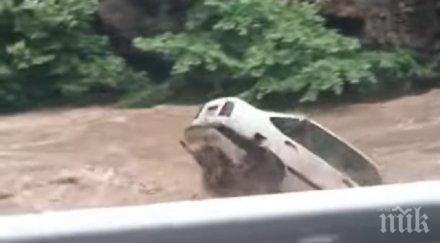 Припомняме, че водата носеше колата буквално като детска играчка в коритото си, и то с много голяма скорост. Колата е била паркирана в непосредствена близост до буйната река, часове преди да попадне в нея читател на ТрафикНюз e подал сигнал до 112 за опасността, но за съжаление, органите не успели да реагират и реката е завлякла колата.