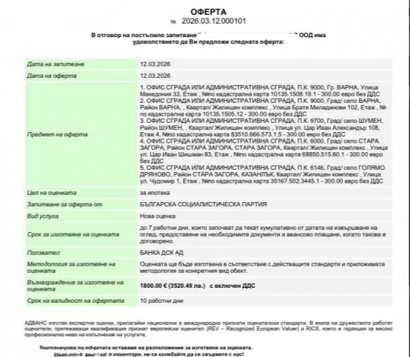 Според офертата услугата представлява "нова оценка" на недвижимите активи, която трябва да бъде изготвена в срок до 7 работни дни след предоставяне на необходимите документи. Цената за изготвянето на оценките е 1800 евро с включен ДДС.