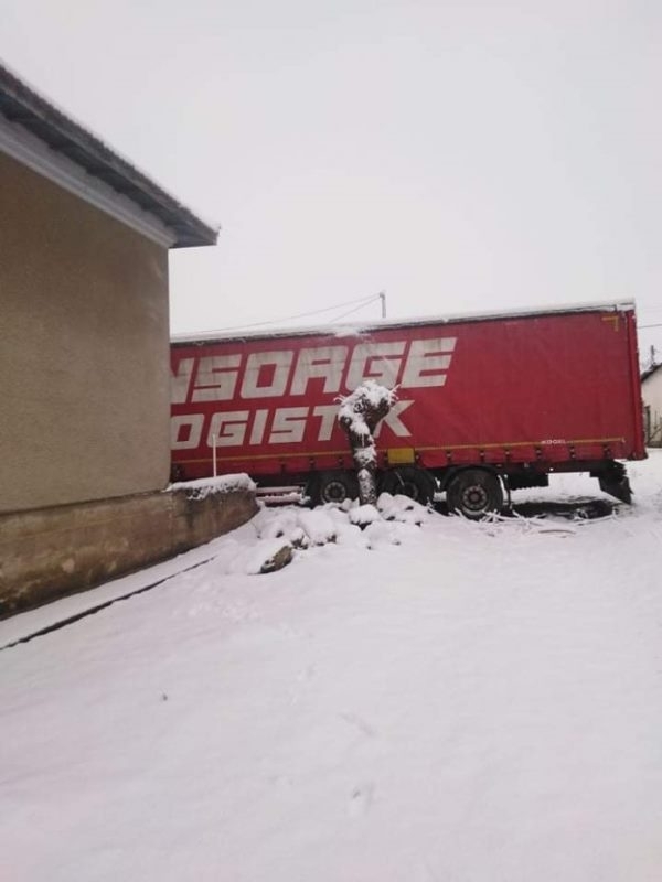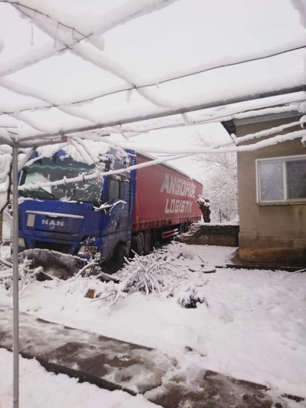 ЗАРАДИ СНЕГА: ТИР се вряза в двора на къща в Гложене, щетите са големи (СНИМКИ)