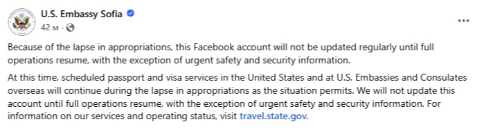 "Поради прекъсване на финансирането, този Фейсбук акаунт няма да бъде актуализиран редовно, докато не бъдат възобновени пълните операции, с изключение на спешна информация, свързана с безопасността и сигурността.