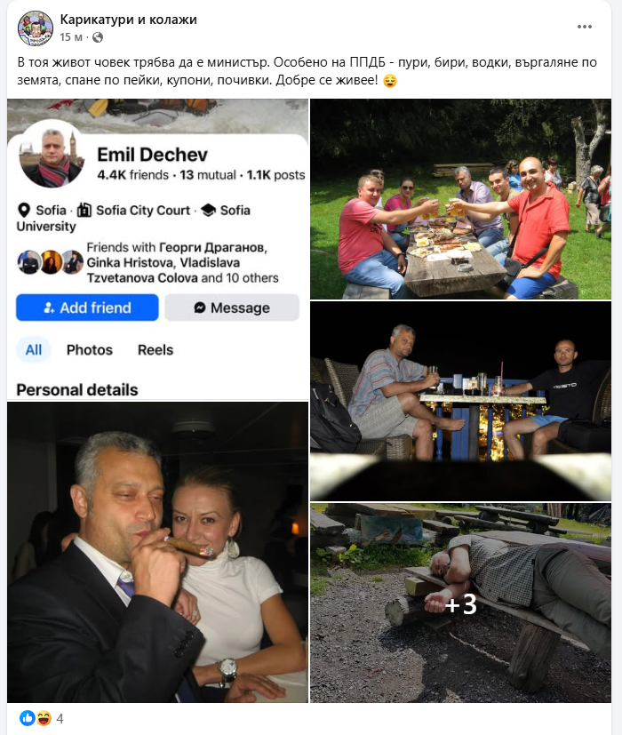 "В тоя живот човек трябва да е министър. Особено на ППДБ - пури, бири, водки, въргаляне по земята, спане по пейки, купони, почивки. Добре се живее", коментира в ироничен пост страницата на политическа сатира "Карикатури и колажи" към снимките с веселия МВР-министър.