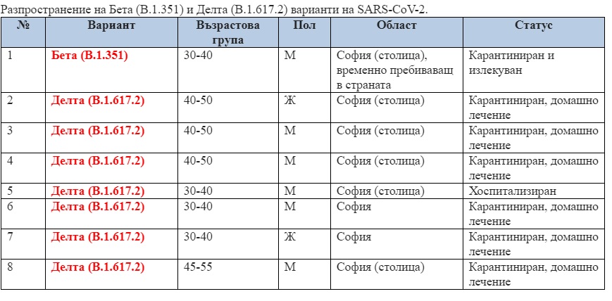 Освен посочените Бета и Делта варианти са анализирани още 192 клинични проби от пациенти от различни региони на страната. 190 от пробите показват Алфа вариант на COVID-19, както и други два изолата, които не се причисляват към вируси с повишено значение.
