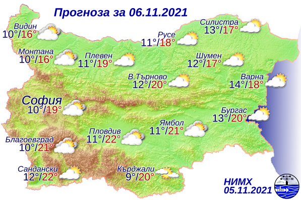 Летните температури, които ни изненадаха неочаквано, ще отстъпят постепенно пред градусите, които подхождат на ноемврийското време. Съботният ден ще започне с тихо и ясно време. В Дунавската равнина ще духа слаб западен вятър. В Южна България и на места в низините и равнините ще бъде мъгливо или с ниска слоеста облачност. Минималните температури ще са между 9 и 14 градуса. Това съобщават от Националния институт по метеорология и хидрология (НИМХ).