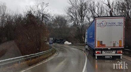ЗА КОЙ ЛИ ПЪТ: ТИР се обърна в канавка на пътя Русе - Велико Търново