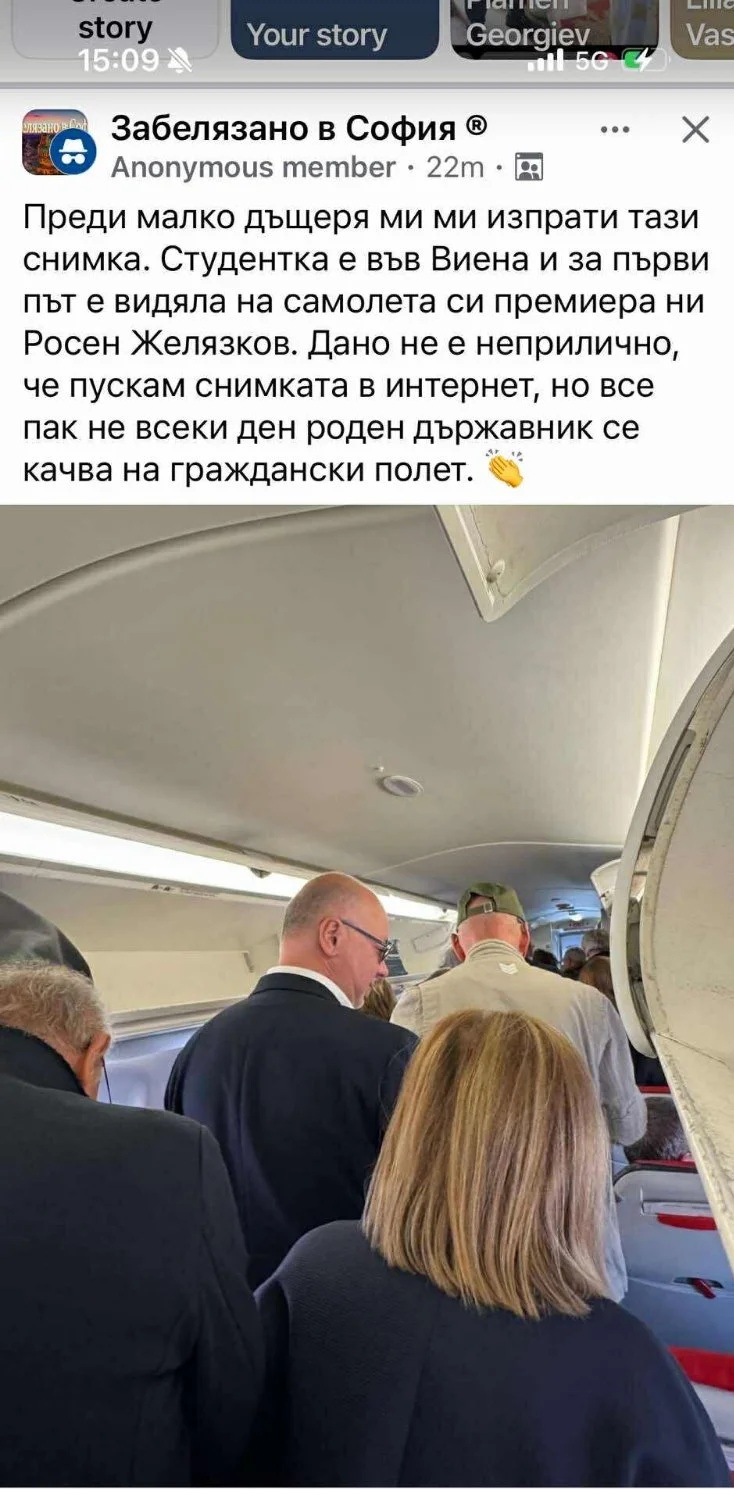 "Преди малко дъщеря ми ми изпрати тази снимка. Студентка е във Виена и за първи път е видяла на самолета си премиера ни Росен Желязков. Дано не е неприлично, че пускам снимката в интернет, но все пак не всеки ден роден държавник се качва на граждански полет", споделя потребителят, публикувал снимката.
