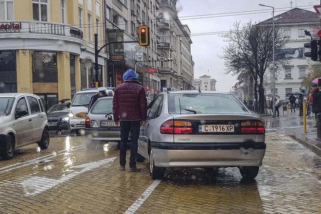 Гражданин закъса с автомобила си на жълтите павета в проливния дъжд в столицата. Наложи се служител на Пътна полиция да излезе от кабинката за регулиране на движението, за да помогне.