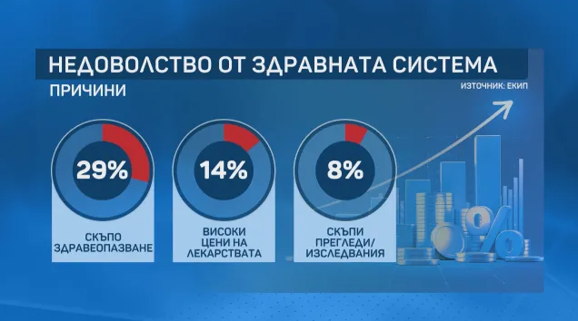 Лекарските услуги са поскъпнали с около 10 на сто. Именно цените са водеща причина за недоволство в системата. Почти всеки трети анкетиран казва, че не е удовлетворен от цените в системата на здравеопазването, а 14% от попитаните - от скъпите лекарства. Едва 8%  не са удовлетворени от цените на прегледите, таксите и изследванията.