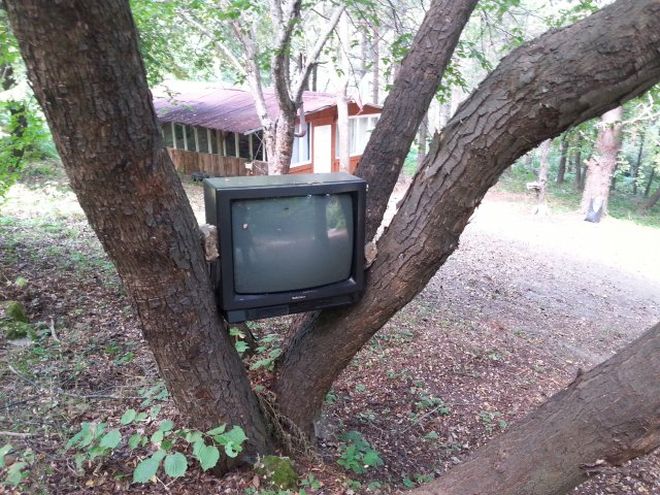 На 6 километра под Върховръх и в горната част на вилната зона на хижа "Бряновщица", остроумен собственик на бунгало намери хитър начин хем да не се лишава от телевизора си "Голд стар", хем да го превърне в нещо като шега за преминаващите туристи. И е станало нещо като авангардна инсталация, съобщава "Марица".