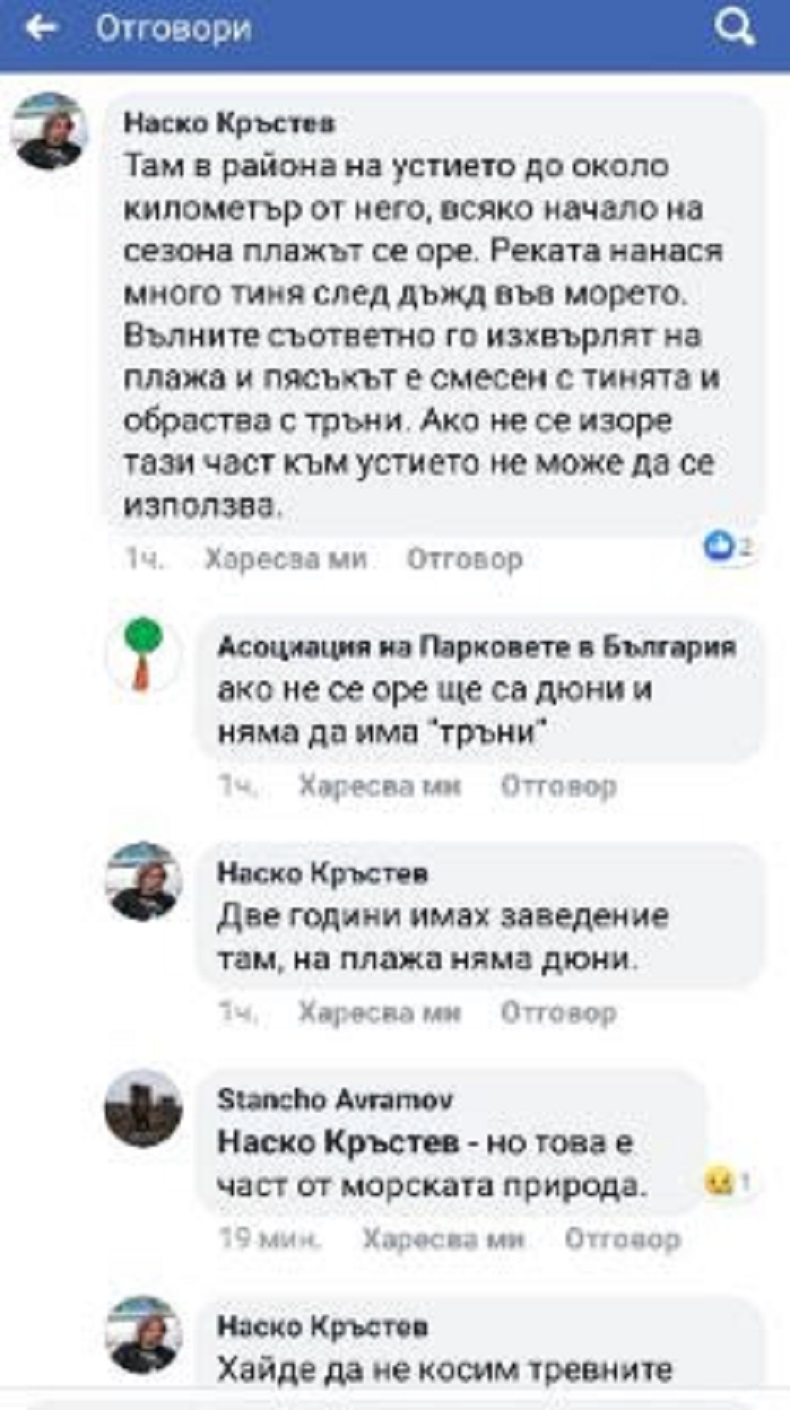 Вчера и днес се случва същото. Министър Ангелкова се изстреля като тапа към Камчия, за да се рови в пясъците, защото Тома Белев бил написал в профила си, че се разорават дюни. И това се оказа измама и фейк новина. По подобна причина, свързана с образуване на тиня на плажа в устието на Камчия, всяка година терена се разорава, за да може да се ползва. Защото ако не се направи това избуяват тръни и не може да се ползва плажа. Това коментира във фейсбук Наско Кръстев.