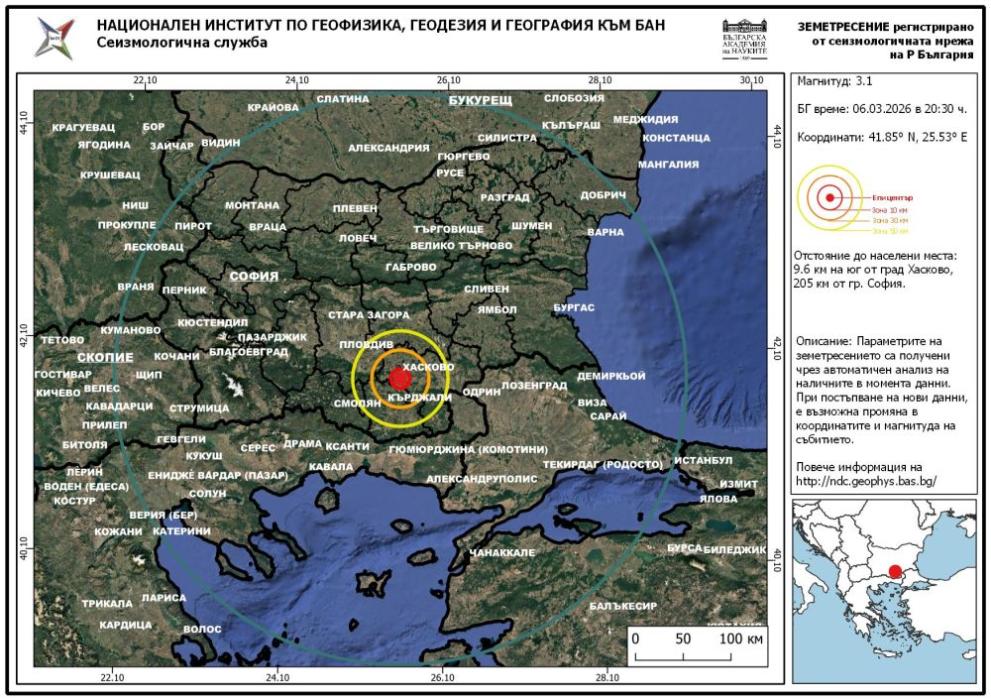 Земетресение с магнитуд 3,1 по Рихтер е регистрирано в района на Хасково, съобщиха от Националния институт по геофизика, геодезия и география към БАН.