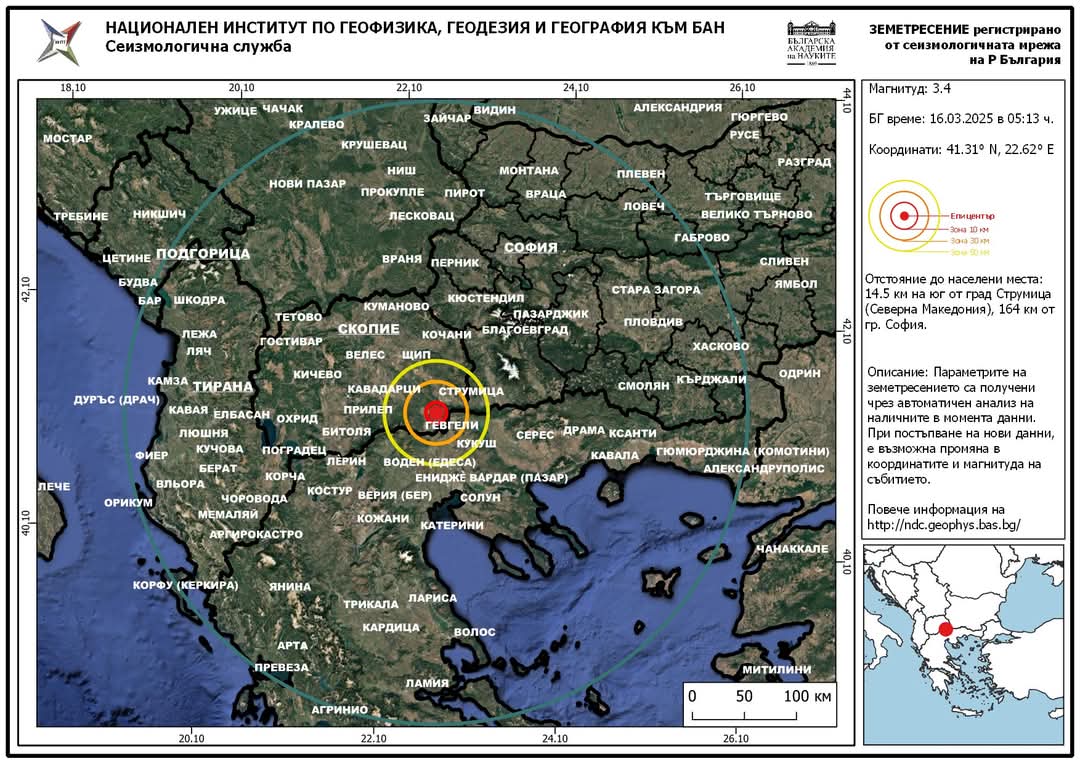 По данни на Националния Сеизмологичен Център към Национален Институт по Геофизика, Геодезия и География-БАН, събитието от 16 март 2025 г., от 05:13 часа българско време е с епицентър на 40 км от град Петрич, на 50 км от град Сандански и на 160 км от град София.