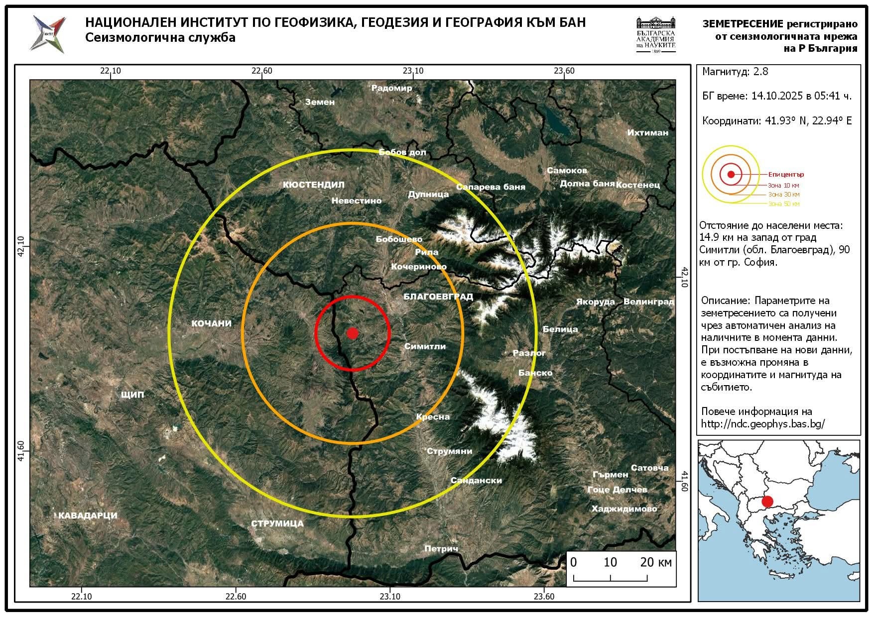 Земетресение с магнитуд 2.8 по Рихтер е регистрирано в района на град Симитли, област Благоевград.