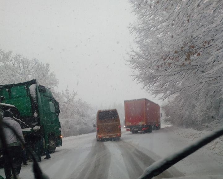 Припомням, че рано тази сутрин ТИР се бе обърнал на пътя. Тежкотоварна техника едва е издърпала камиона, а минути след това, друг ТИР отново блокира пътя, след като решил да изпреварва колоната от автомобили и камиони.