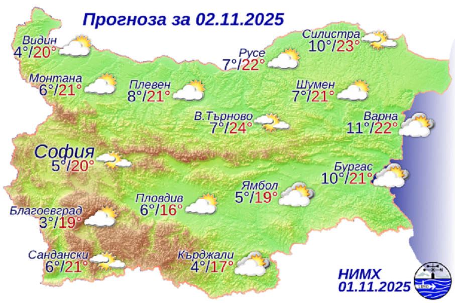 На места в равнинната част от страната тази сутрин ще се образува мъгла или ниска слоеста облачност. Минималните температури ще бъдат между 5° и 10°, по-ниски в котловините. В София минималната температура ще бъде около 5°.