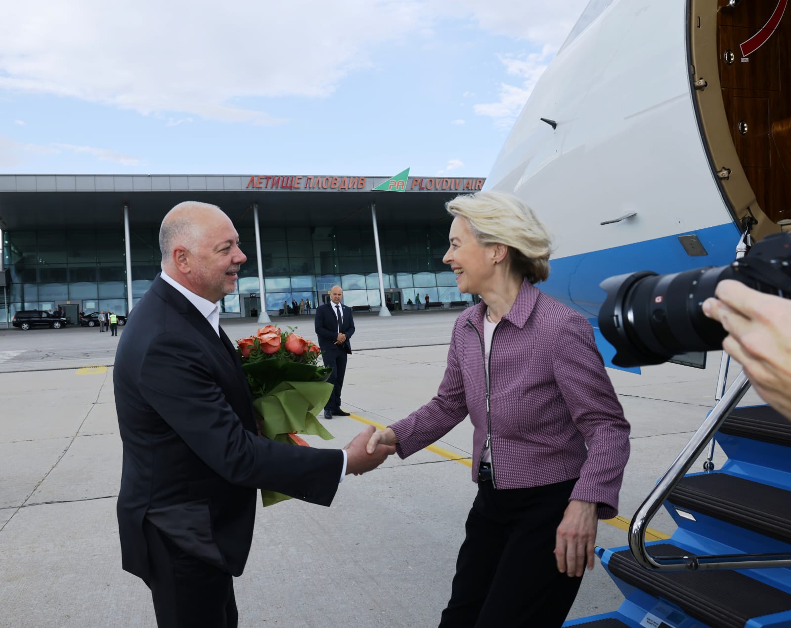 Председателят на ЕК Урсула фон дер Лайен пристигна на посещение в България. Тя кацна на летището в Пловдив и беше посрещната с голям букет цветя от премиера Росен Желязков.