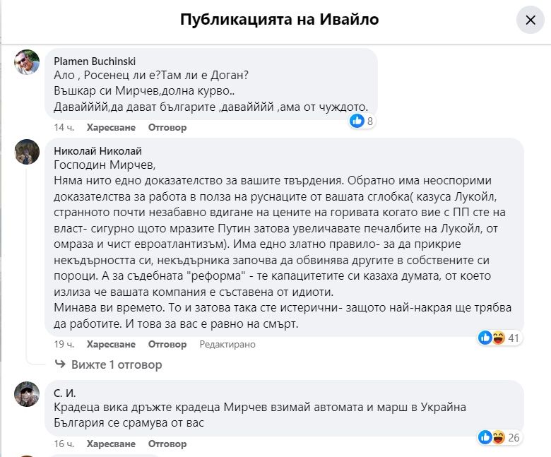 "Няма нито едно доказателство за вашите твърдения. Обратно има неоспорими доказателства за работа в полза на руснаците от вашата сглобка (казуса "Лукойл", странното почти незабавно вдигане на цените на горивата когато вие с ПП сте на власт - сигурно щото мразите Путин затова увеличавате печалбите на "Лукойл", от омраза и чист евроатлантизъм). Има едно златно правило - за да прикрие некъдърността си, некъдърникът започва да обвинява другите в собствените си пороци. А за съдебната "реформа" - те капацитетите си казаха думата, от което излиза, че вашата компания е съставена от идиоти.