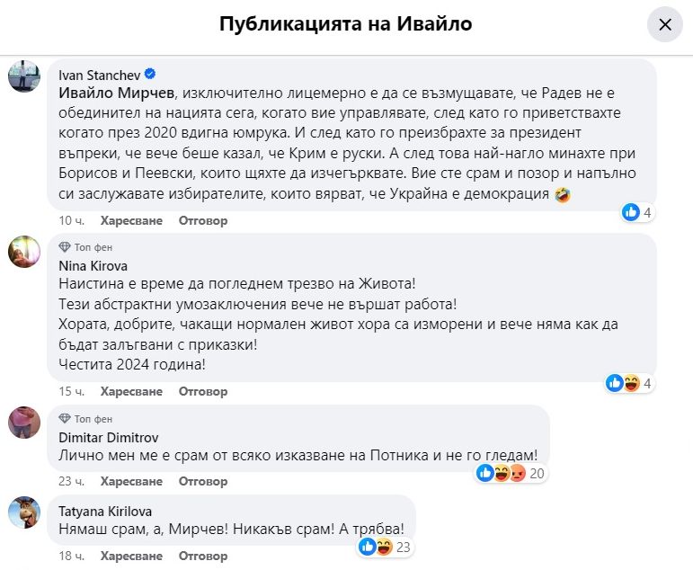 Иван Станчев го допълни: "Изключително лицемерно е да се възмущавате, че Радев не е обединител на нацията сега, когато вие управлявате, след като го приветствахте когато през 2020 вдигна юмрука. И след като го преизбрахте за президент въпреки, че вече беше казал, че Крим е руски. А след това най-нагло минахте при Борисов и Пеевски, които щяхте да изчегърквате. Вие сте срам и позор и напълно си заслужавате избирателите, които вярват, че Украйна е демокрация".