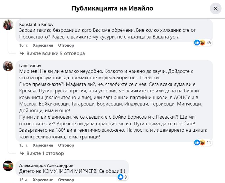 Е кое премахнахте?! Мафията ли? Не, сглобихте се с нея. Сега всяка дума ви е Кремъл, Путин, руска агресия, при условия че всичките сте или деца на бивши комунисти (включително и вие), или завършили партийни школи, в АОНСУ и в Москва. Бойкикиевци, Тагаревци, Борисовци, Инджевци, Терзиевци, Минчевци, Дойновци, има и още!