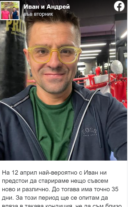 "На 12 април най-вероятно с Иван ни предстои да старираме нещо съвсем ново и различно. До тогава има точно 35 дни. За този период ще се опитам да вляза в такава кондиция, че да съм близо физически до професионален спортист, леко попрестарял. Защо? Скоро ще разберете... Слагам го тук, за да съм длъжен да го изпълня. Да видим!“, написа във Фейсбук той.