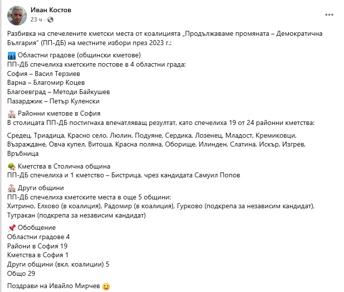 Потребител във Фейсбук с името Иван Костов обаче прави разбивка на кметовете на ППДБ и се оказва, че общо те имат едва 29 кметове на общини, райони и областни градове.