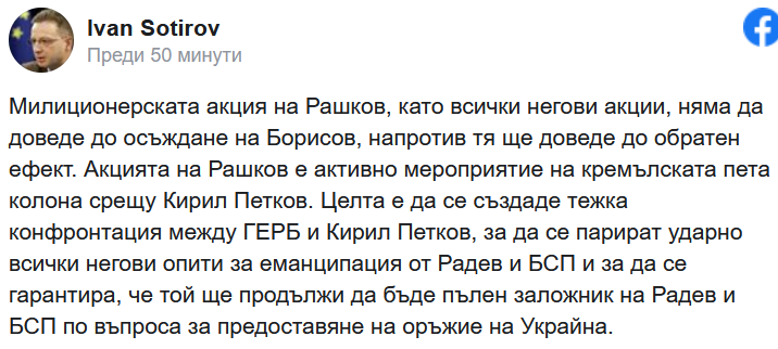 Целта е да се създаде тежка конфронтация между ГЕРБ и Кирил Петков, за да се парират ударно всички негови опити за еманципация от Радев и БСП и за да се гарантира, че той ще продължи да бъде пълен заложник на Радев и БСП по въпроса за предоставяне на оръжие на Украйна, пише още Сотиров.