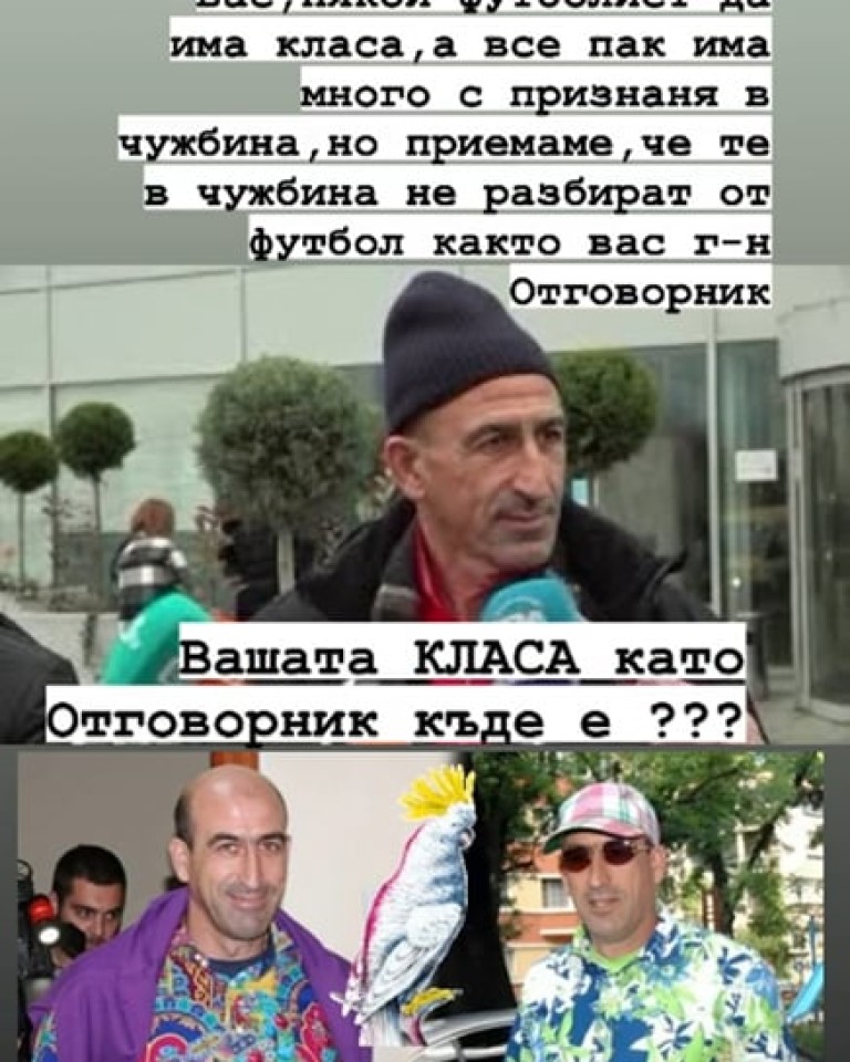 "Г-н Отговорник, за 12 години не чух от Вас някой футболист да има класа, а все пак има много с признания в чужбина, но приемаме, че те в чужбина не разбират от футбол както Вас, г-н Отговорник. Вашата класа като отговорник къде е?", написа Попето в Инстаграм.