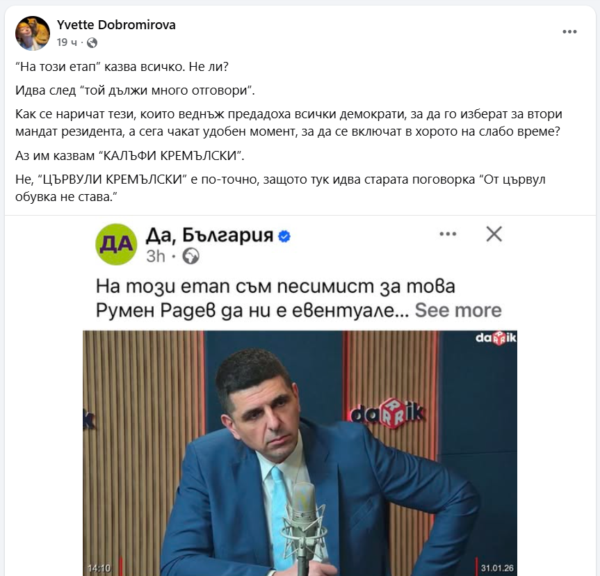 Аз им казвам "КАЛЪФИ КРЕМЪЛСКИ". Не, "ЦЪРВУЛИ КРЕМЪЛСКИ" е по-точно, защото тук идва старата поговорка "От цървул обувка не става", написа Добромирова в социалната мрежа.