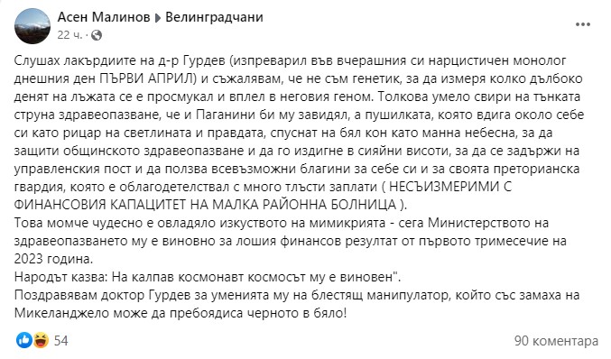 "Слушах лакърдиите на д-р Гурдев (изпреварил във вчерашния си нарцистичен монолог днешния ден ПЪРВИ АПРИЛ) и съжалявам, че не съм генетик, за да измеря колко дълбоко денят на лъжата се е просмукал и вплел в неговия геном. Толкова умело свири на тънката струна здравеопазване, че и Паганини би му завидял, а пушилката, която вдига около себе си като рицар на светлината и правдата, спуснат на бял кон като манна небесна, за да защити общинското здравеопазване и да го издигне в сияйни висоти, за да се задържи на управленския пост и да ползва всевъзможни благини за себе си и за своята преторианска гвардия, която е облагодетелствал с много тлъсти заплати (НЕСЪИЗМЕРИМИ С ФИНАНСОВИЯ КАПАЦИТЕТ НА МАЛКА РАЙОННА БОЛНИЦА ).