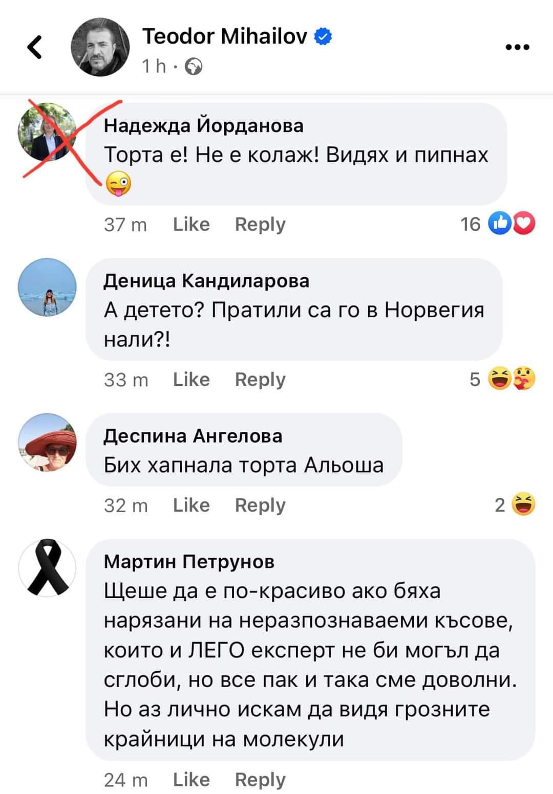 Депутатката направи глупостта да се включи с коментар под публикацията на активиста на ППДБ Теодор Михайлов, в чийто фейсбук профил тортата със захарно тесто се появи около обяд днес.