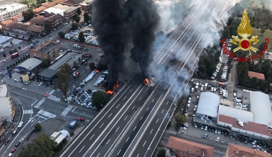 Магистралният мост на кръстовището Касалечио A1-A14, който частично гледа към Виа Емилия в Борго Панияле, се е сринал частично. Колоната от дим, причинена от огъня, се вижда от целия град. На място има много линейки за спасяване на ранените. Пътят на магистралата е затворен в двете посоки.
