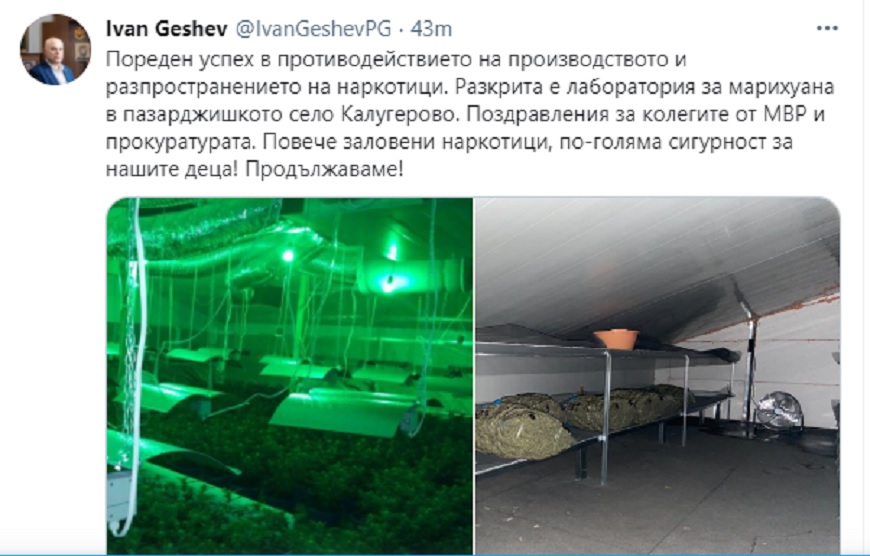 "Пореден успех в противодействието на производството и разпространението на наркотици. Разкрита е лаборатория за марихуана в пазарджишкото село Калугерово. Поздравления за колегите от МВР и прокуратурата. Повече заловени наркотици, по-голяма сигурност за нашите деца! Продължаваме!", написа в профила си в Туитър Иван Гешев.