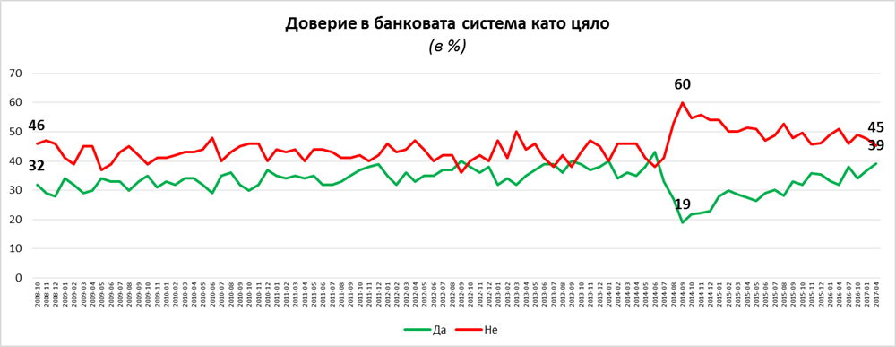„Галъп интернешънъл“ е единствената агенция, която разполага с данни за доверието в банковата система за близо десетилетие назад – последното замерване е през април, а данните се движат в устойчиви равнища. Разбира се, трябва да се има предвид, че като цяло българите имат негативна оценка за всички основни институции и когато доверие и недоверие са в сходни нива (както в случая), това вече е добра новина.