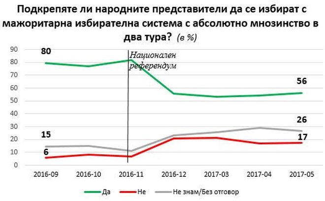 Половин година след провеждането на Националния референдум, делът на подкрепящите въвеждането на мажоритарна избирателна система остава значителен – 56%, но е чувствително под нивата от около 80%, които се регистрираха преди референдума. Негативните отговори трайно са се увеличи – от 6% през есента до 17% през месец май. Явно развилата се след референдума кампания за пояснение на потенциалните негативи на мажоритарния вот е повлияла.