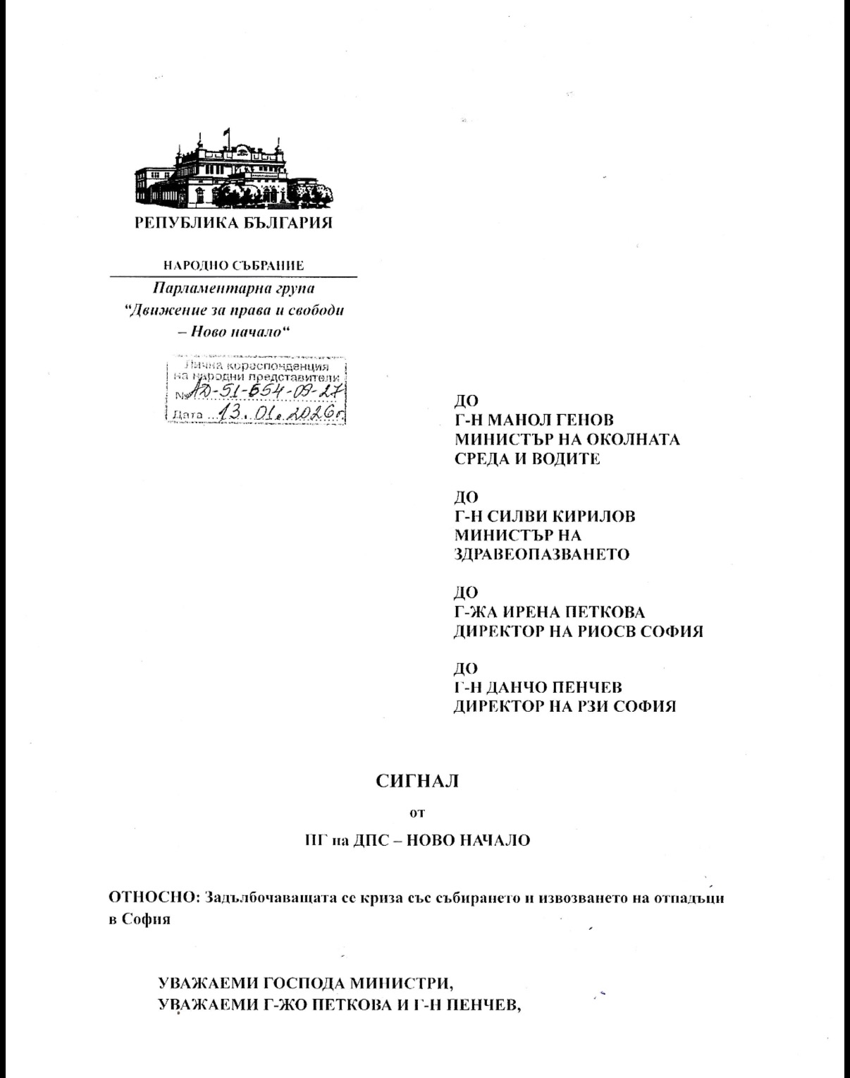 Сигнал до министъра на екологията Манол Генов и министъра на здравеопазването Силви Кирилов, и до шефовете на РИОСВ София - Ирена Петкова и на РЗИ - София Данчо Пенчев във връзка с кризата с боклука на София пусна ПГ на ДПС-НОВО НАЧАЛО.