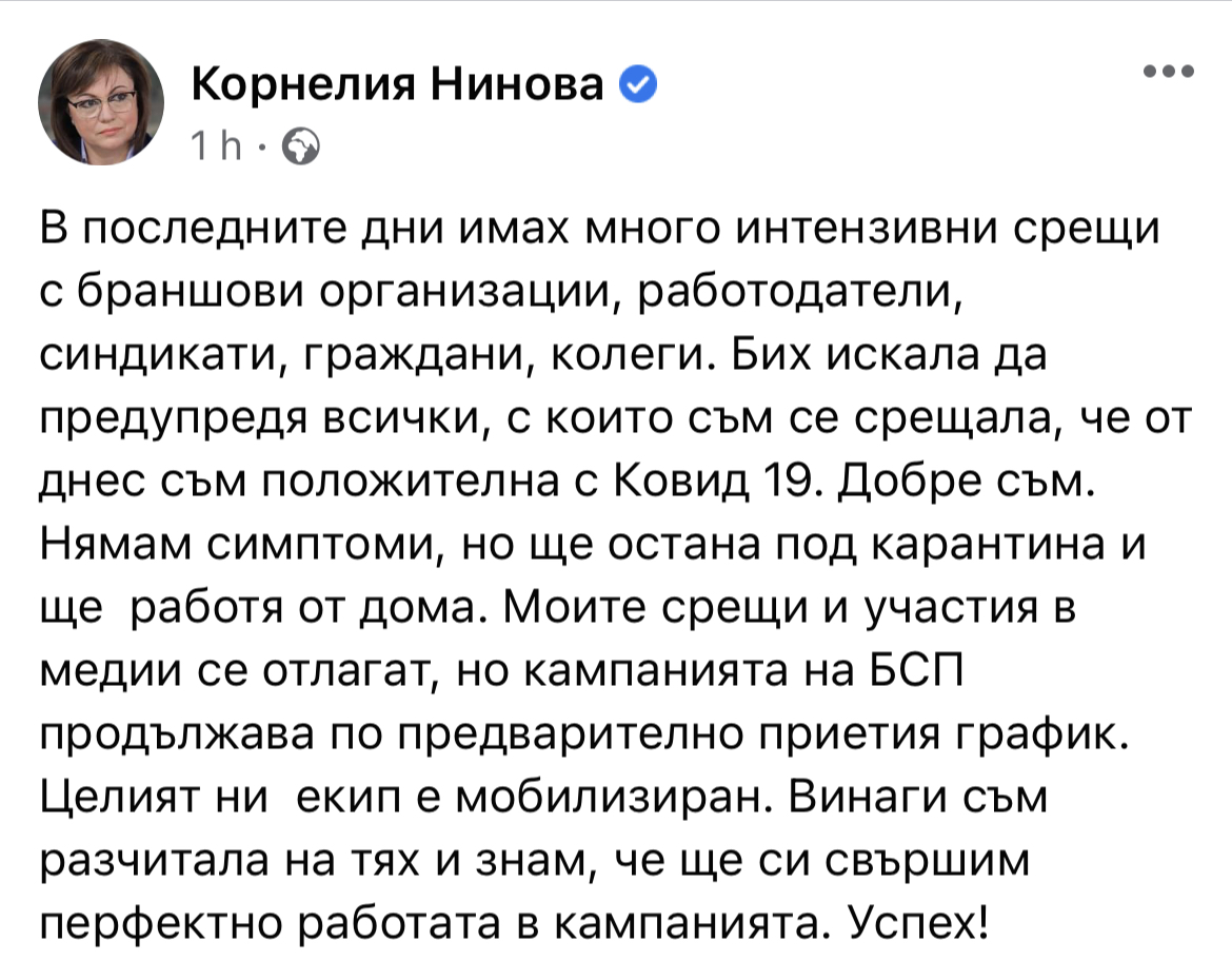 „В последните дни имах много интензивни срещи с браншови организации, работодатели, синдикати, граждани, колеги. Бих искала да предупредя всички, с които съм се срещала, че от днес съм положителна с COVID-19”, пише Нинова.