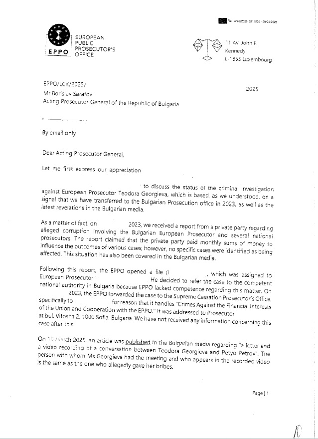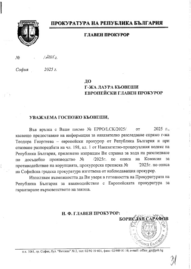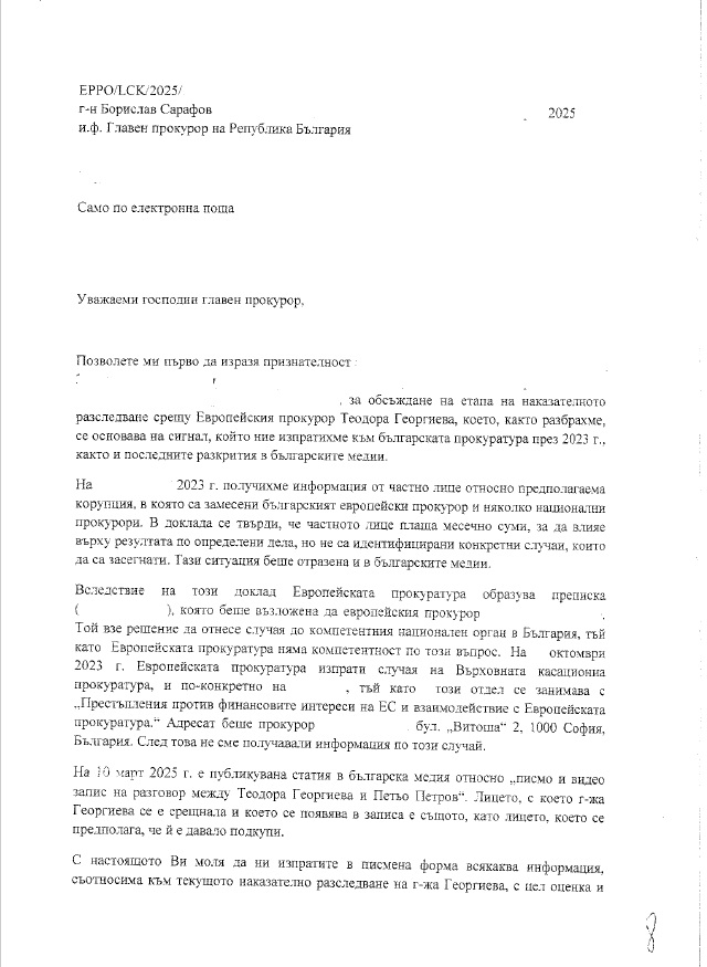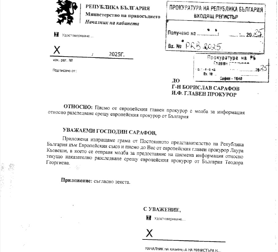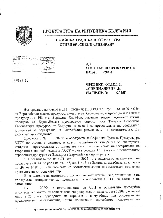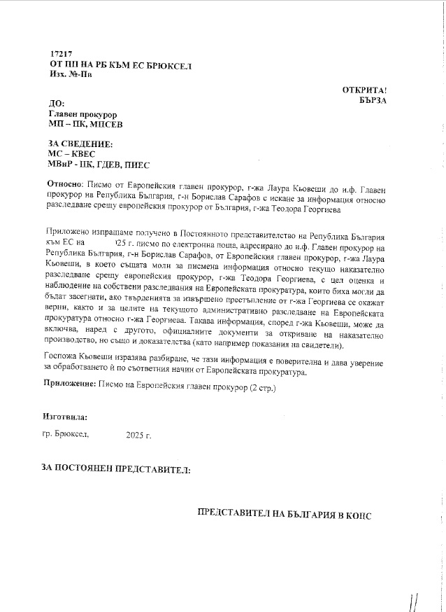 На 30 април 2025 г. до кабинета на главния прокурор на Република България е изпратена открита грама от Постоянното представителство на страната в европейските институции в Брюксел, съпроводена от писмо на Европейския главен прокурор г-жа Лаура Кьовеши до и.ф. главен прокурор Борислав Сарафов с искане за предоставяне на писмена информация, включително показания на свидетели по текущо наказателно производство срещу представителя на България в Европейската прокуратура.