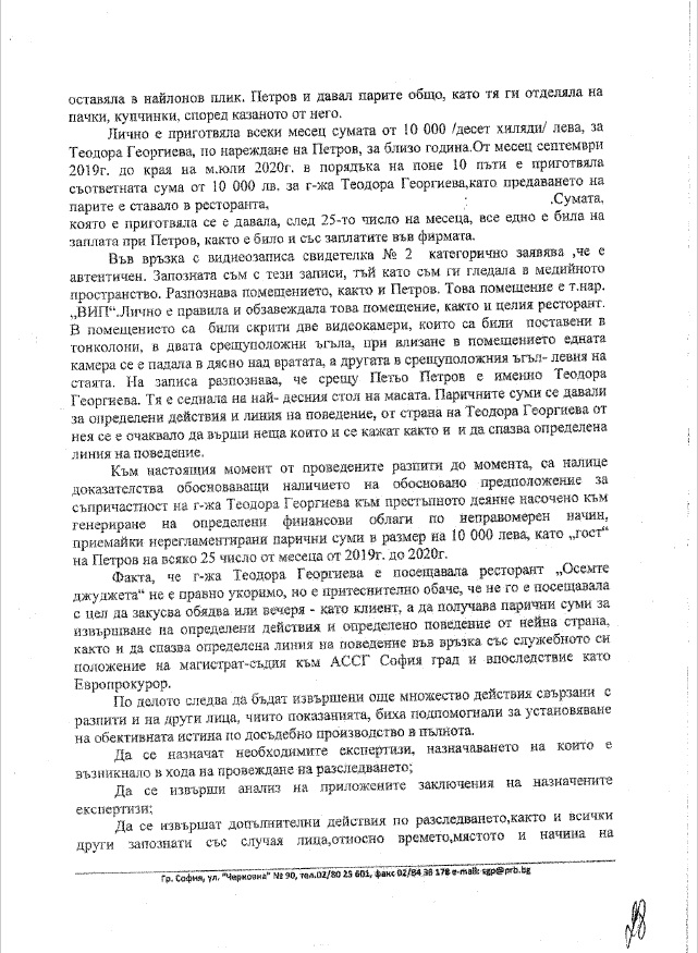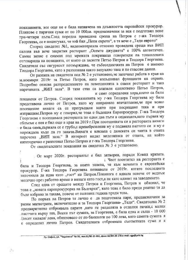 В справката се съдържат извадки от показания на трима свидетели, разпитани в хода на разследването, които сочат за ежемесечно предоставяне от „Пепи Еврото“ на сумата от 10 000 лева на магистрата „Теди Еврото“.