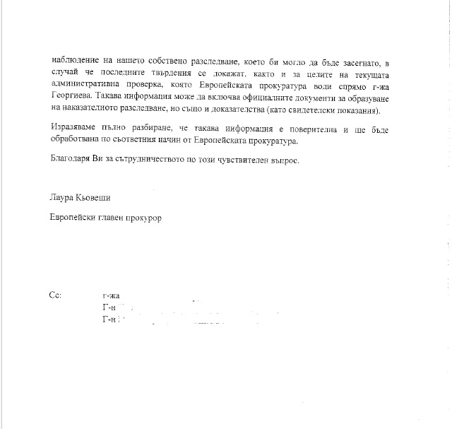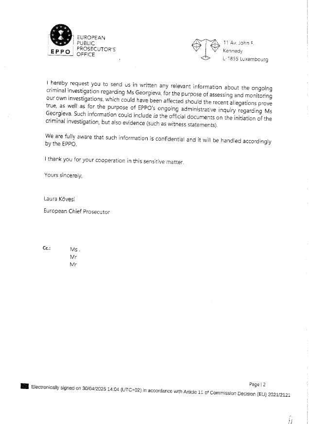 В писмото г-жа Лаура Кьовеши посочва, че в Европейската прокуратура е образувана преписка относно предполагаема корупция на българския европейски прокурор вследствие на получен в институцията сигнал от частно лице на 24 октомври 2023 г. С оглед публикация в българска медия от 10 март 2025 г. относно „писмо и видеозапис на разговор между Теодора Георгиева и Петьо Еврото“, Европейският главен прокурор отправя официално искане за предоставяне на „всякаква информация, съотносима към текущото наказателно разследване на г-жа Георгиева, с цел оценка и наблюдение на нашето собствено разследване, което би могло да бъде засегнато“.