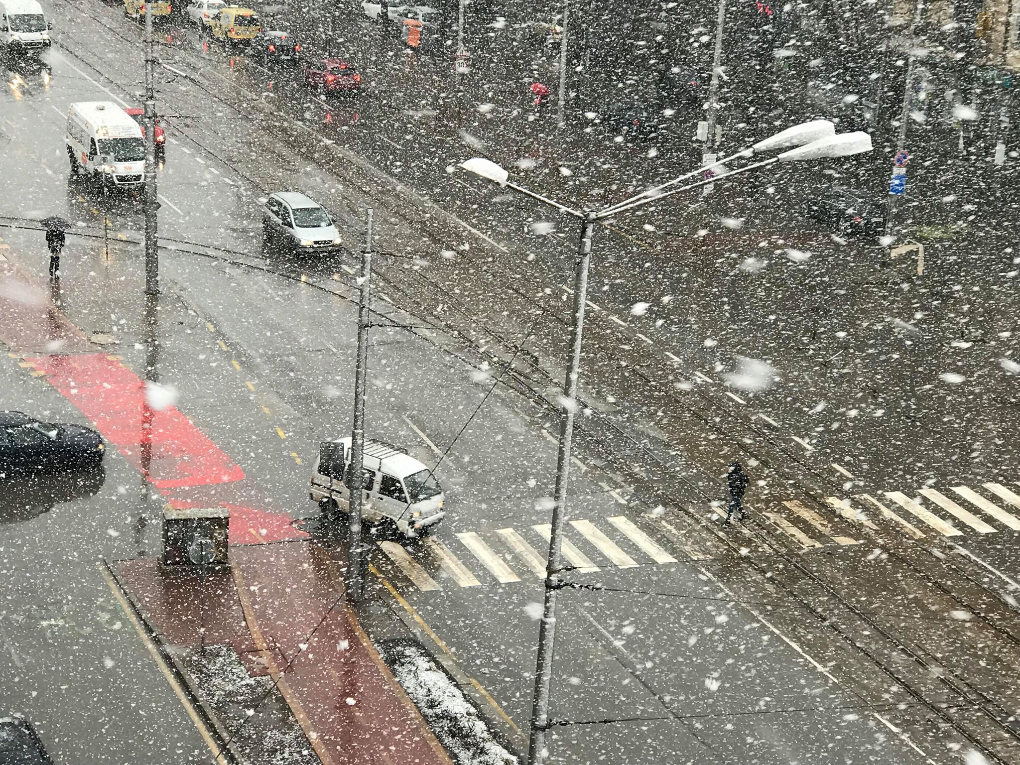 Шофьорите трябва да карат внимателно в натоварения трафик до обяд. Снежна покривка трудно ще се образува, защото температурите не са толкова ниски, но колите и покривите вече започнаха да побеляват.