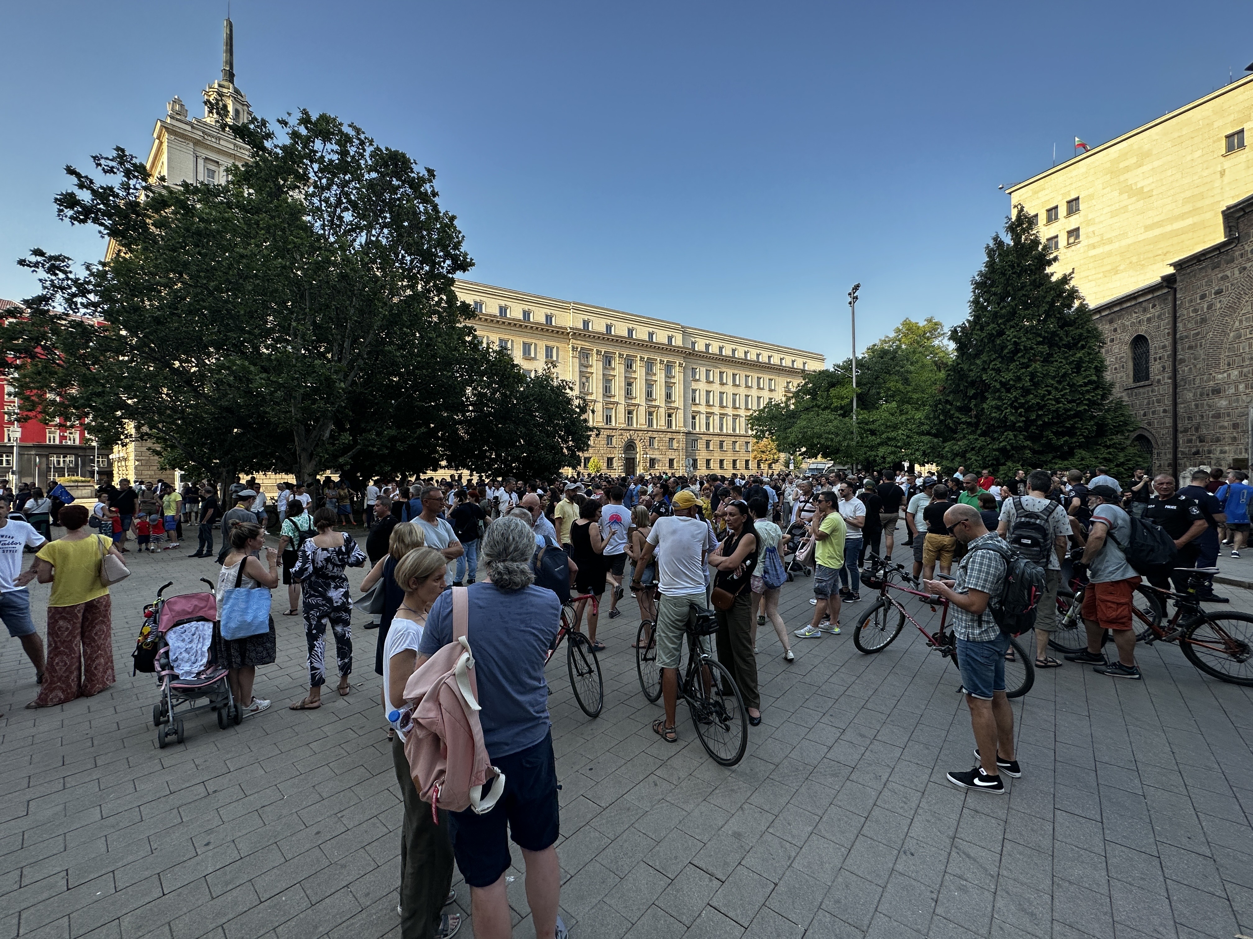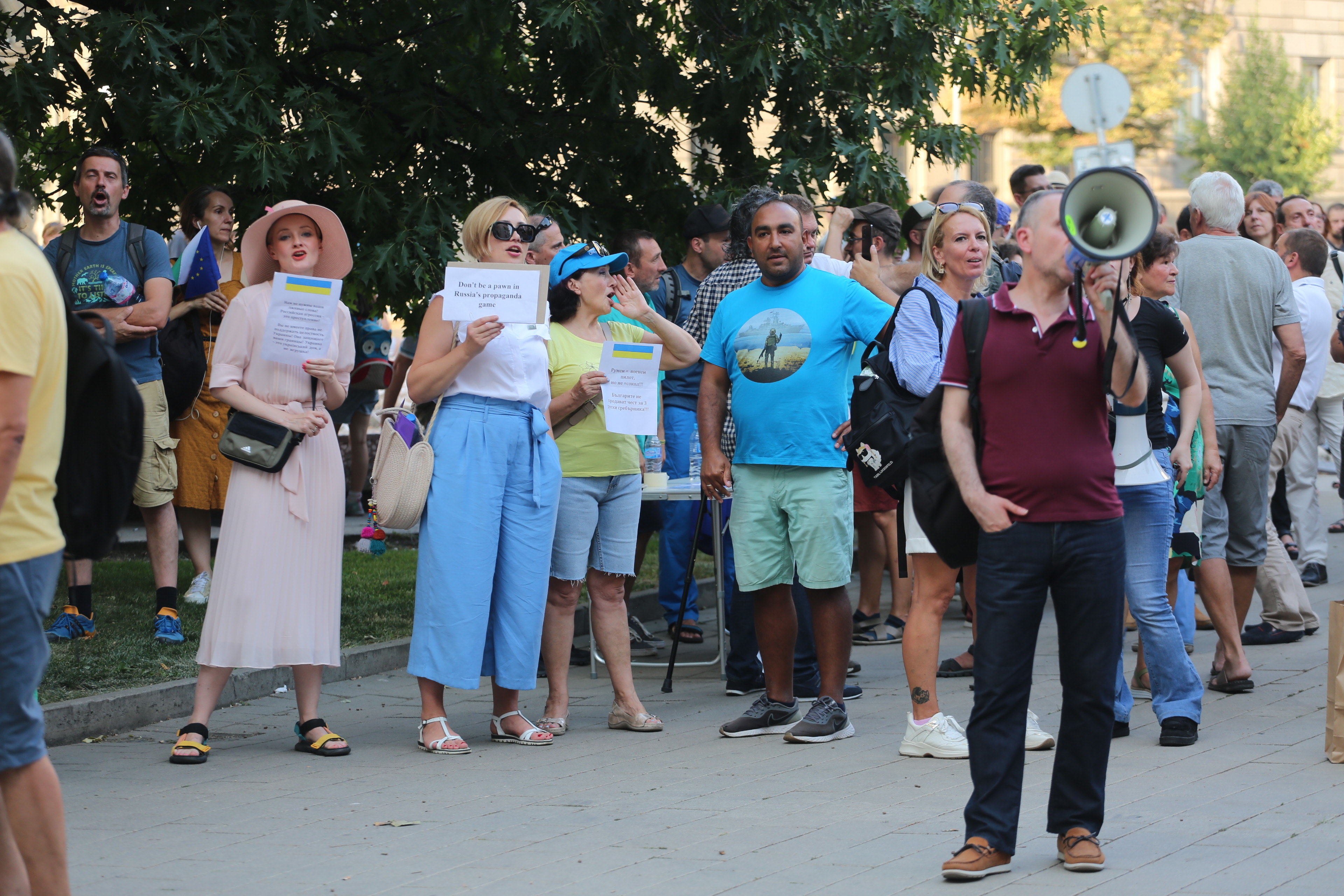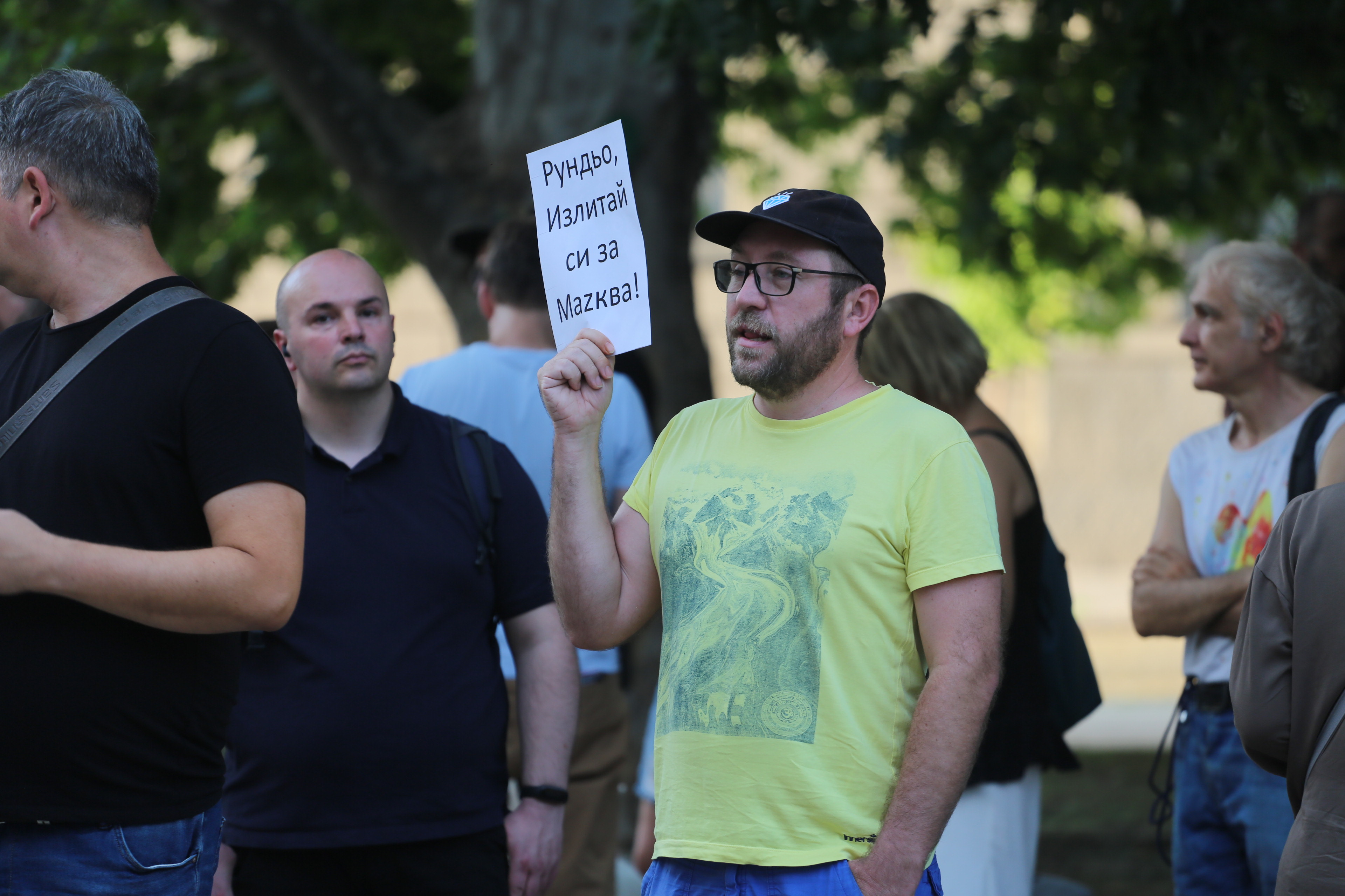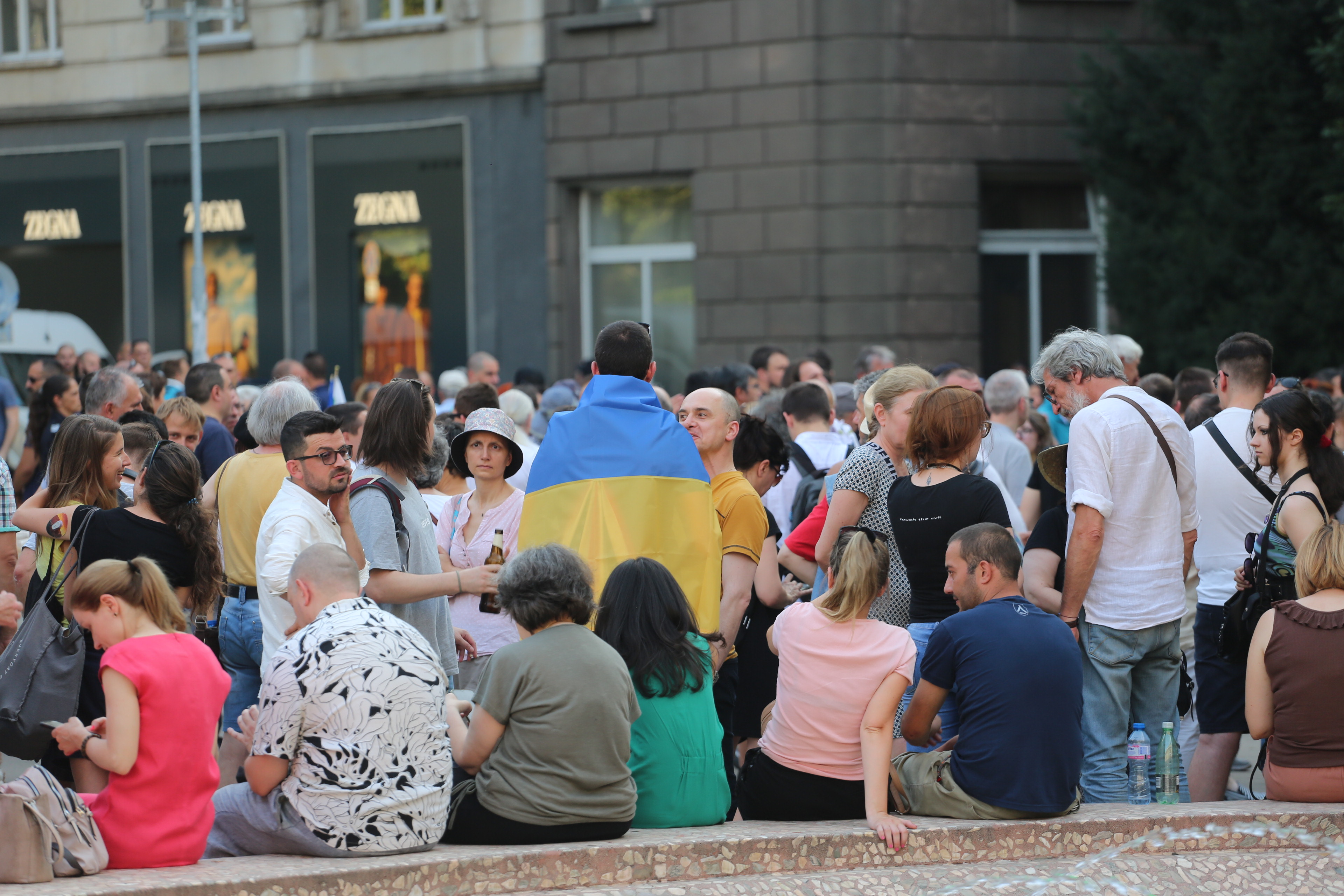 Събралите се скандираха "Тук не е Москва", "Импийчмънт на Радев" и "Радев, не си човек". Имаше хора, загърнати с украинското знаме. Развяваха се и флаговете на ЕС и НАТО. Българското знаме не се забелязваше.