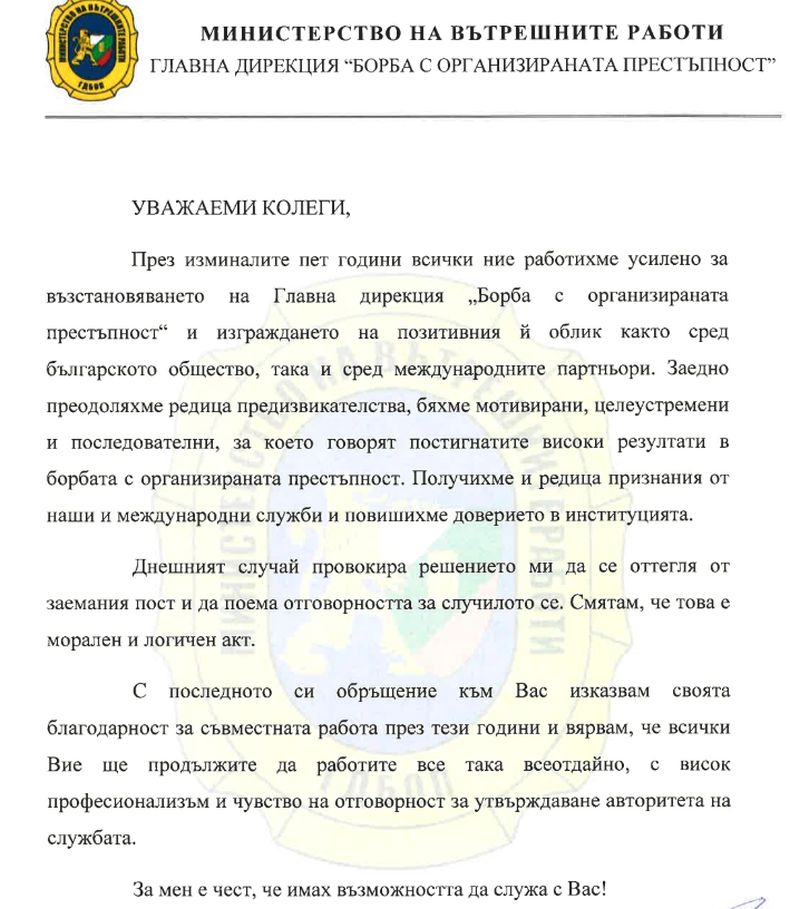 Шефът на ГДБОП Ивайло Спиридонов е подал оставка. Затова съобщава самият той в обръщение публикувано на сайта на дирекцията.