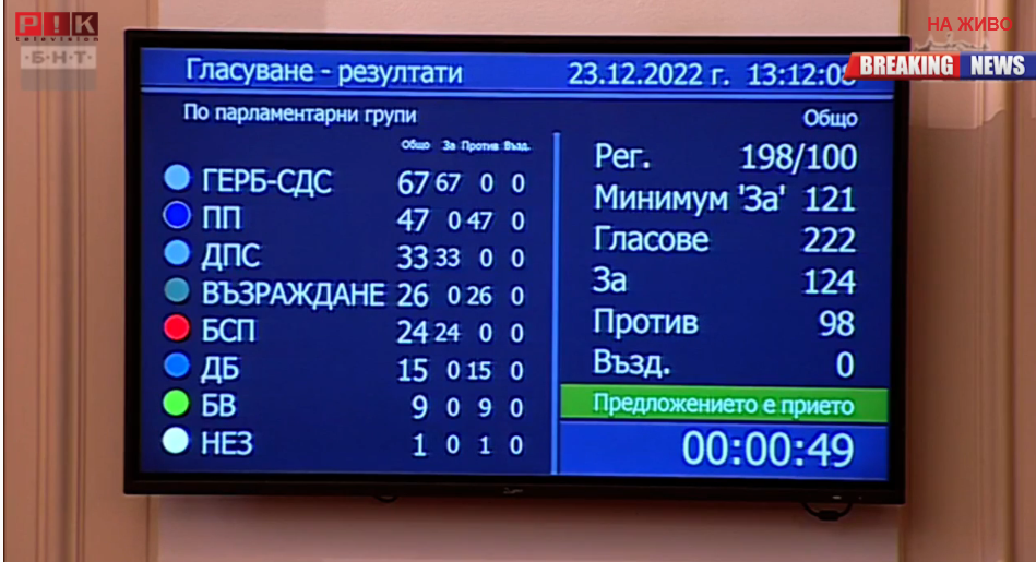 Последва втори режим на гласуване. Гласуваха 226 народни представители, За - 125, Против - 101, няма въздържали се.