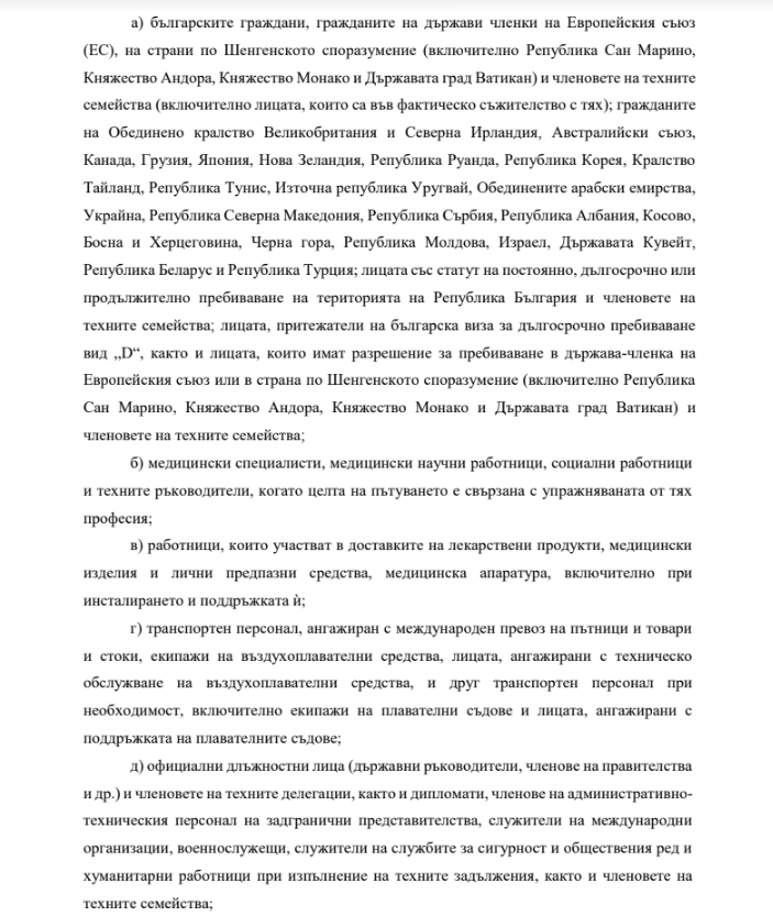 От утре, 2 февруари, до 30 април, влизащите в страната български граждани и лицата със статут на постоянно, дългосрочно или продължително пребиваване на територията на Р България и членовете на техните семейства, които не представят документ за отрицателен резултат от проведен до 72 часа преди влизането у нас PCR-тест, се поставят под карантина за срок от 10 дни, като карантината може да бъде отменена при отрицателен резултат от PCR-тест, извършен 24 часа след пристигането в България.